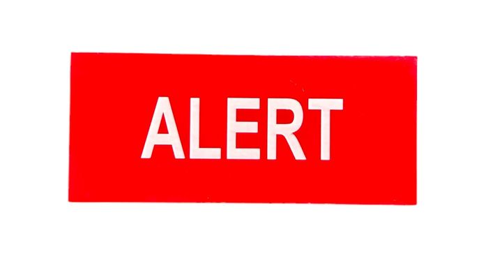 - ALERT White on Red Background 115 x 50mm Laser Engraved UV Stabilised Plastic Sign inc Double Sided Tape