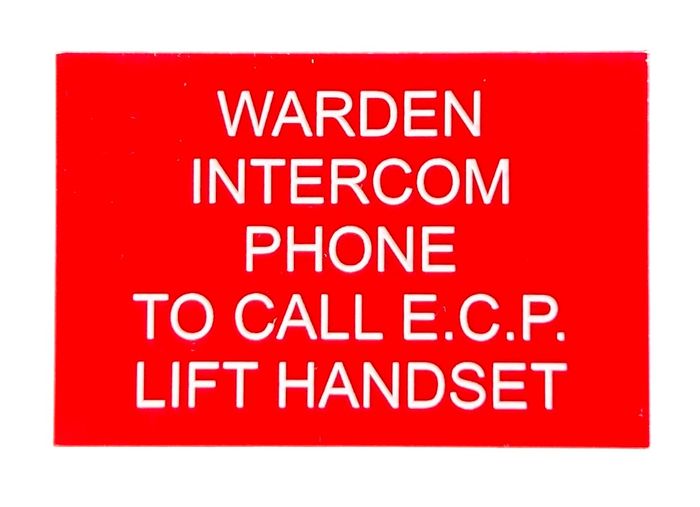 - WARDEN INTERCOM PHONE TO CALL E.C.P. LIFT HANDSET White on Red Background 75 x 50mm Laser Engraved UV Stabilised Plastic Sign inc Double Sided Tape